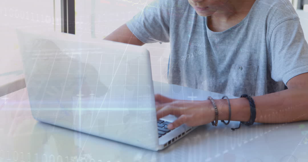 Young boy engaged in programming activities on a laptop with overlay of data graphs. Ideal for illustrating online learning and digital education. Can be used for content on e-learning, childhood education, and technology advancements in schools.
