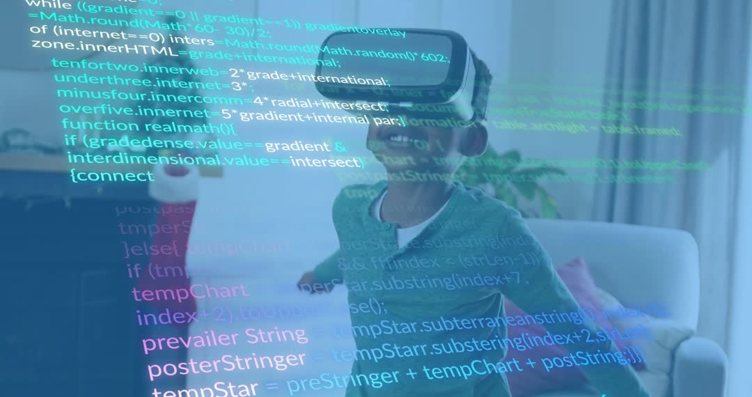 - Young Boy Experiencing Virtual Reality with Code Overlay