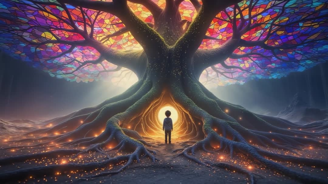 AI Generated Image. Preteen boy is stepping into an illuminated arch formed by tree roots, standing in visually stunning misty clearing. Overhead, colorful branches form vibrant canopy creating scene filled with wonder and fantasy. Perfect for uses in projects involving concepts of imagination, adventure, magic, and the beauty of nature. Suitable for book covers, story illustrations, fantasy artwork, and inspirational posts depicting wanderlust or enchanted worlds.