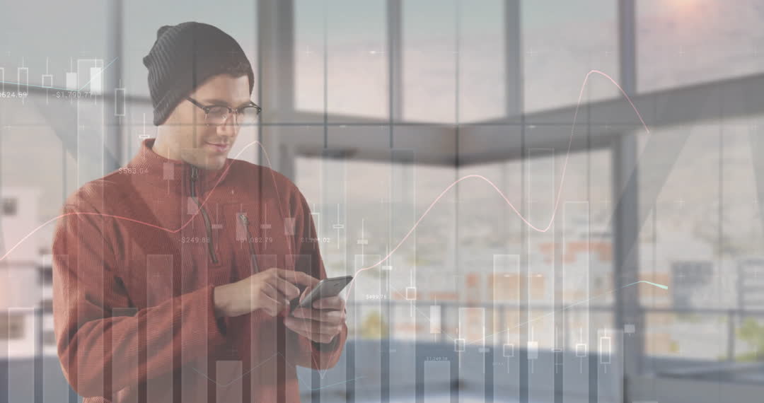 Young man wearing beanie and jacket using smartphone in front of dynamic business charts. Overlay of financial graphs suggests stock market or financial analysis, depicting technology's role in modern business. Immersive blend of individual focus and abstract data reflects global finance trends. Suitable for themes in finance, technology, and modern business dynamics.