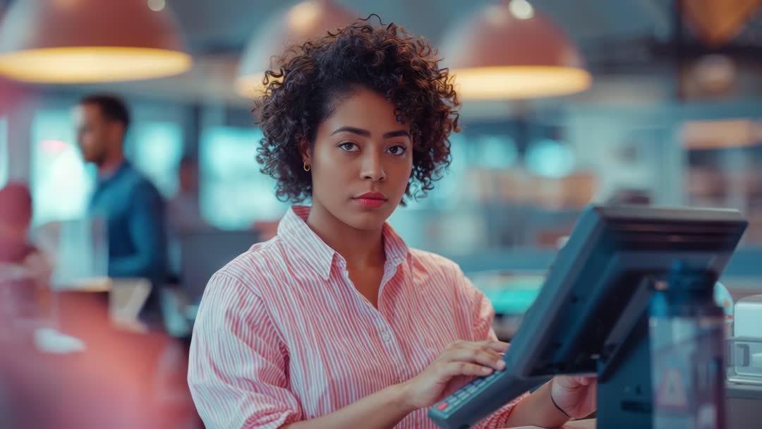 AI Generated Image. Video clip showing young female cashier entering customer order on touchscreen POS at busy cafe counter. Warm pendant lighting creating cozy atmosphere while blurred customers adding depth and energy. Shot highlighting hands-on POS interaction, focused facial expression, and modern payment technology. Useful for marketing materials for cafe websites, mobile ordering apps, hospitality training videos, social media ads, and business presentations. Working well for illustrating themes of customer service, point of sale systems, small business operations, contactless payment, staff training, and workplace efficiency. File suitable for hero banners, explainer videos, blog headers, and promotional campaigns.