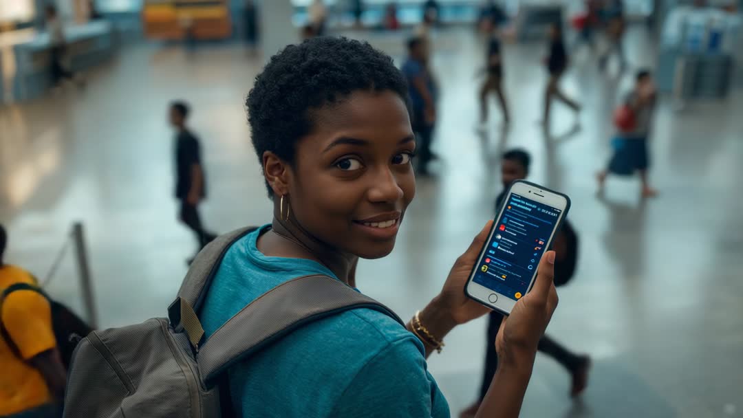 AI Generated Image. Video frame showing young woman on mezzanine overlooking busy station concourse, checking smartphone and glancing back toward camera. Composition capturing over-shoulder view of phone screen with app notifications, shallow depth of field isolating subject from moving crowd below. Lighting and natural motion conveying real-world commuter routine, modern connectivity, and on-the-go app engagement. Use for travel and transport campaigns, mobile app demos, commuter lifestyle content, urban mobility stories, social media ads, blog headers, website hero clips, and editorial segments about public transit or digital life. Suitable for highlighting user interface interactions, notification design, passenger experience, and diversity in transit imagery.