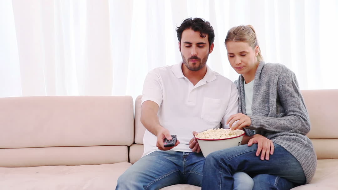 - Young Couple Eating Popcorn While Watching Movie Together at Home