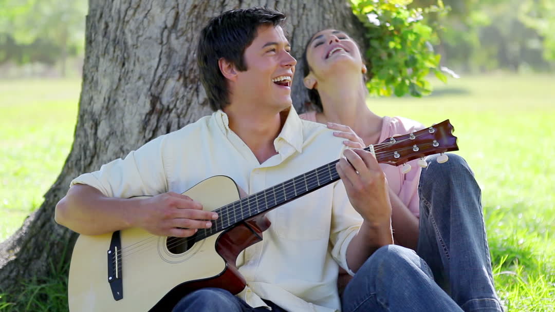 Young man playing a guitar while sitting under a tree with his girlfriend. Both are laughing and enjoying each other's company in a natural setting. Ideal for content about outdoor leisure, romantic getaways, and music lifestyle.