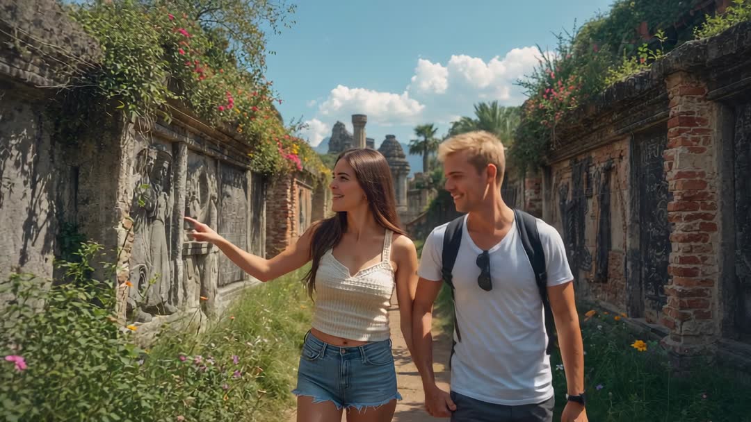 AI Generated Image. Showing young couple holding hands while walking through sunlit ancient temple corridor lined with carved stone reliefs and overgrown flowers. Female pointing at reliefs while male wearing backpack and sunglasses hanging from shirt smiling and following. Lush vegetation and bright sky adding tropical vacation mood and sense of discovery. Perfect for travel blog intros, tourism campaign videos, cultural heritage documentaries, romantic travel reels, destination marketing, tour operator promos, educational clips about archaeology, lifestyle and relationship content, hotel or resort advertising, social media reels and YouTube vlogs. Editing suggestions: crop for vertical mobile reels, add title overlay, use slow tracking shot, include ambient music and natural sound, add map graphic for location context, pair with voiceover about history or cultural significance.