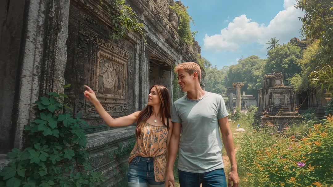 AI Generated Image. Showing young couple exploring overgrown jungle temple ruins, woman pointing at intricate stone bas-relief while holding hands with partner. Framing lush greenery and creeping vines around weathered carvings, casting sunlit midday sky for warm, natural tones. Serving travel vlog footage, romantic tourism promo, cultural heritage documentary, adventure commercial, website hero banner, social media reel. Suggesting editing approach: starting with wide establishing shot of temple complex, following with medium tracking shot of couple, cutting to close-up on bas-relief and hand gestures, adding ambient jungle sound and soft instrumental music. Recommending use by travel agencies, tour operators, hotel and resort campaigns, cultural festival promotion, educational content about archaeology and restoration, and lifestyle storytelling. Offering flexible duration for short social clips or longer narrative scenes.