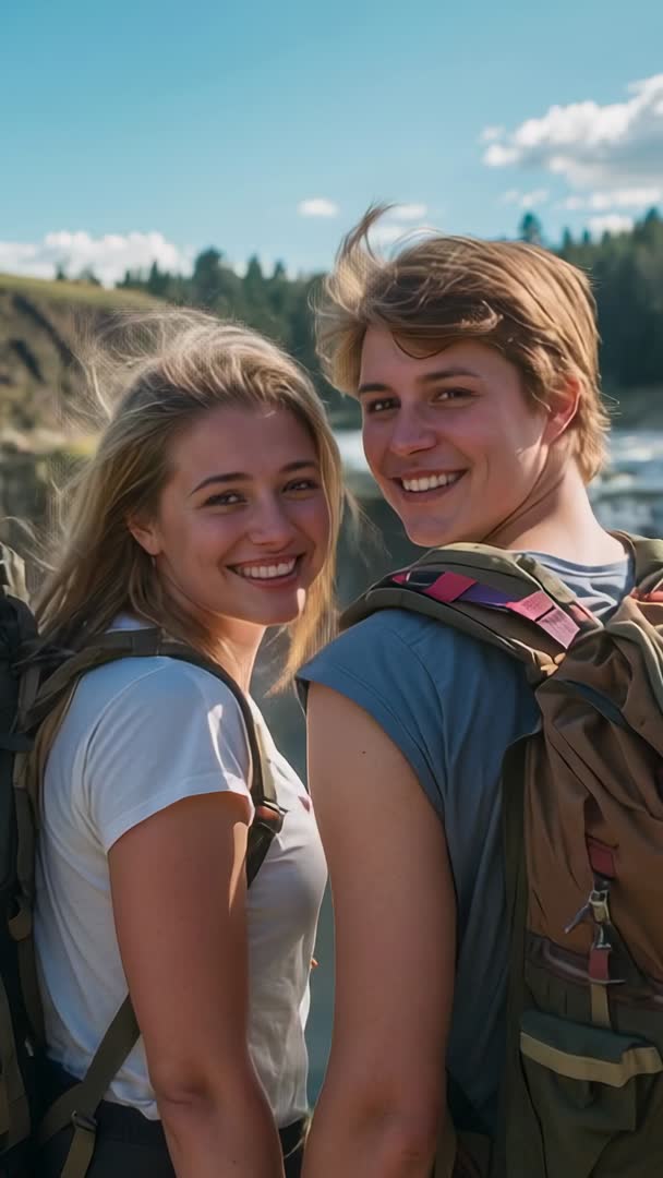 AI Generated Video. Showing two young adults turning toward camera while standing on ridge overlooking river valley, carrying backpacks and smiling. Capturing natural light, wind-blown hair, friendly eye contact, and relaxed body language for authentic travel moment. Offering vertical frame for mobile viewing and short-form video platforms. Serving travel blog intros, outdoor gear promotions, tourism campaigns, social media reels, and mobile ads. Allowing fluid edits into longer travel videos or using as standalone vertical clip for story-driven content. Providing high-energy, optimistic mood suitable for lifestyle, relationships, and adventure themes.