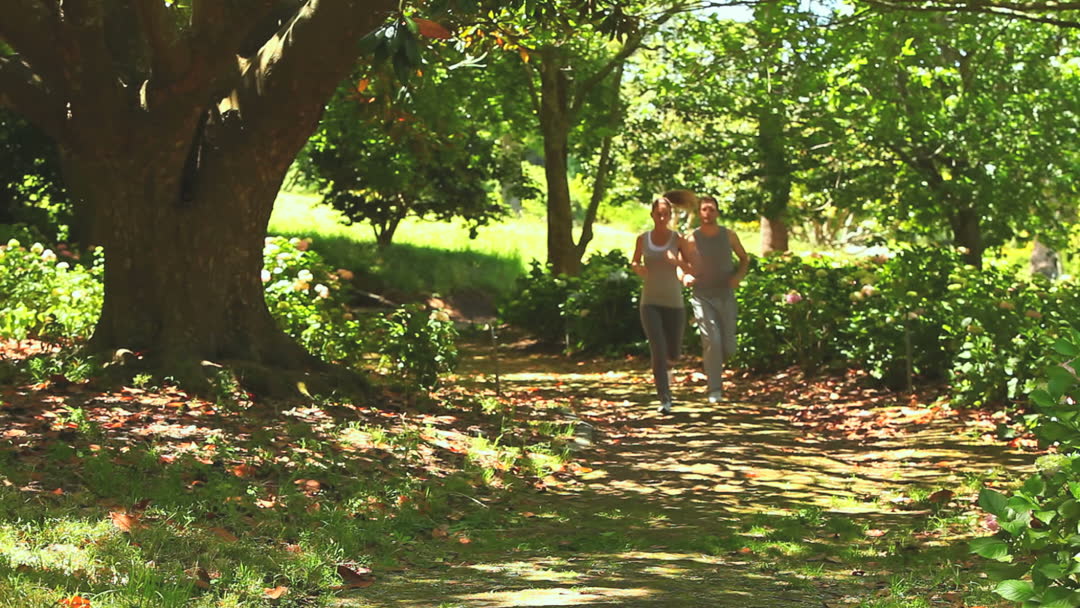 Couple enjoying outdoor exercise are seen jogging along a tree-covered woodland path on a sunlit day, capturing a moment of health and fitness amidst nature. Ideal for promoting active lifestyles, fitness programs, environmental initiatives, or relaxation in natural settings.