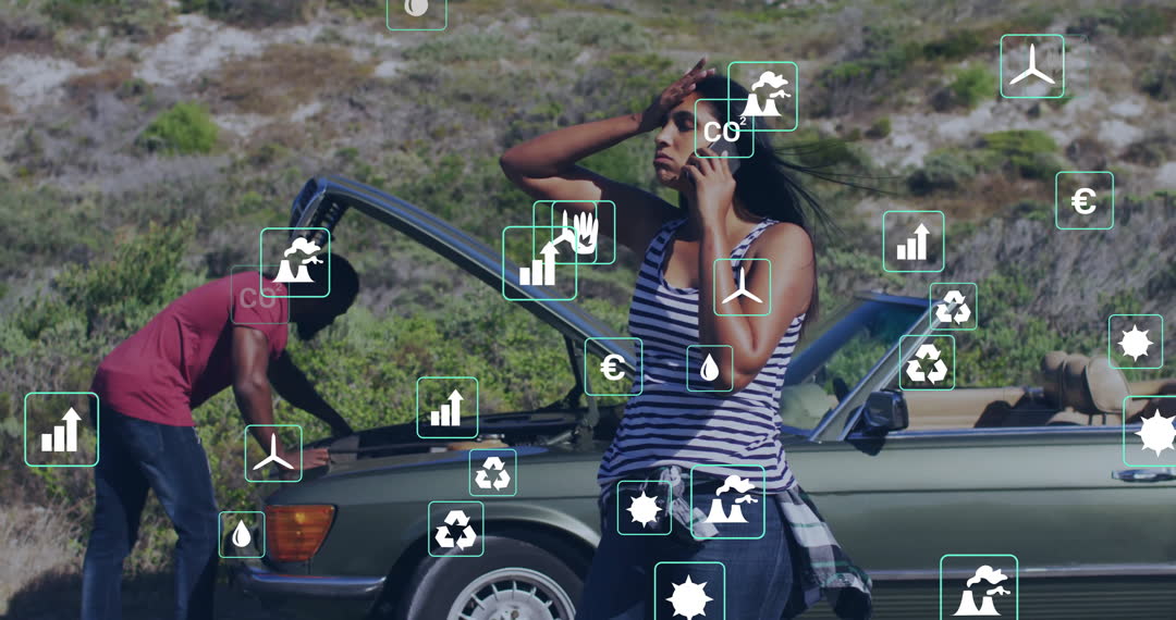 Image shows a young woman on phone next to an open-hood car as a man checks under the hood. Digital eco-friendly icons overlay conveys themes of sustainability, environmental awareness, and innovative technology. Useful for illustrating green automotive solutions, mobile assistance services, or promoting eco-friendly initiatives in transportation.