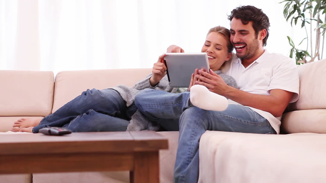 - Young Couple Relaxing with Tablet on Cozy Sofa