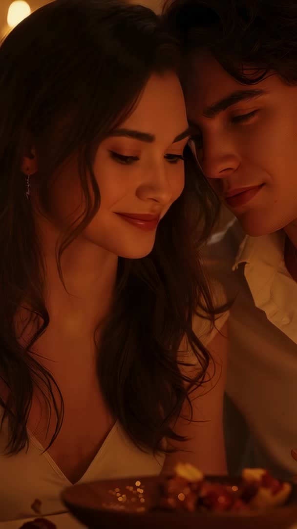 AI Generated Video. Showing intimate vertical footage of young couple leaning close during candlelit dinner, exchanging soft smiles and tender gaze. Creating warm amber lighting and flattering skin tones to evoke romantic mood. Focusing close-up on facial expression, eye contact, and subtle body language for emotional connection. Suiting dating app promos, romantic film trailers, restaurant Valentine campaigns, lifestyle blogs, social reels, and TikTok ads. Working well as backdrop for romantic quotes, product overlays, or voiceover about relationships. Suggesting keeping slow paced cuts, adding soft piano or acoustic guitar, and applying slight film grain for cinematic feel. Licensing ideas including commercials for fine dining, jewelry, perfumes, relationship counseling, wedding planning, and travel romance packages.