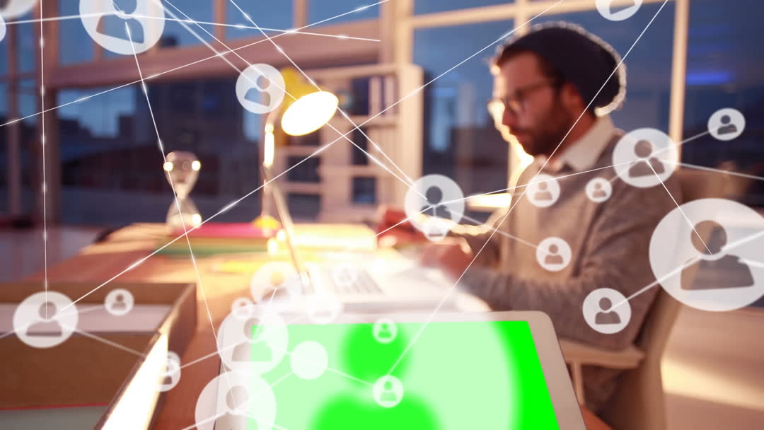 Creative professional working in a modern office environment while engaging with digital network lines depicting connectivity. Ideal for themes of global networking, digital communication in business, or using technology for creative work. Could be used in features focusing on remote work, collaborative projects, or lifestyle of creative entrepreneurs.