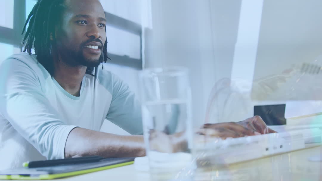 A young African man works attentively on a computer in a bright modern office, with a glass of water and a tablet nearby. This video encapsulates the blend of contemporary business and personal health often balanced by young professionals. Ideal for use in modern business contexts, presentations depicting young entrepreneurs, articles about work-life balance, or content exploring technology and innovation in workspace.