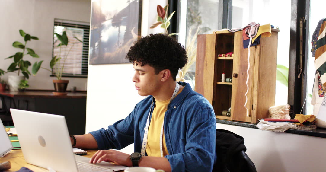 Young male fashion designer working in a well-lit studio, focusing on sketching new clothing designs while utilizing a laptop for additional references. Perfect for use in content about modern fashion design, creative work environments, small business entrepreneurship, and the integration of technology in design. It could highlight the diversity and innovation in fashion industries or feature young professionals in creative careers.