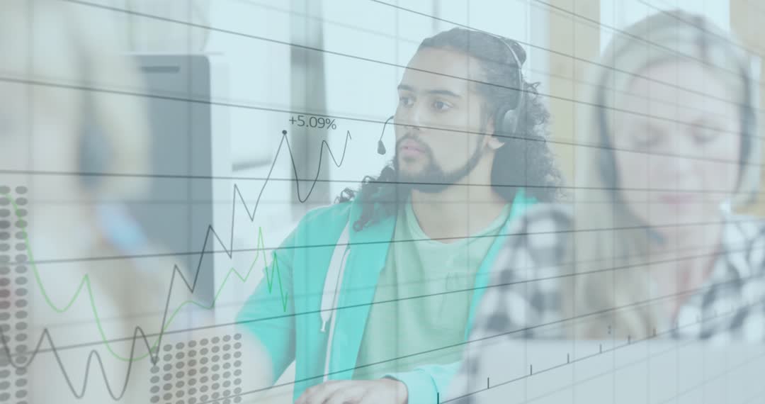 A focused young financial analyst is observing stock market data on connected monitors with financial charts overlayed. This video is useful for illustrating concepts of financial analysis, trading, stock market efficiency, or modern workplace environments involving teamwork and collaboration in tech-driven finance sectors.