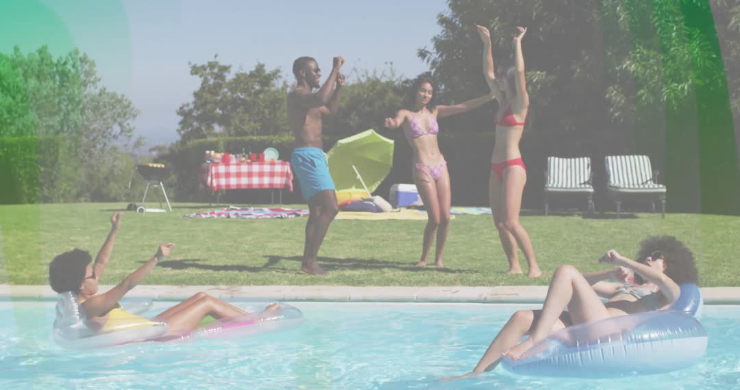 Group of young adults energetically dancing beside a pool while floaties remain in the foreground, creating a lively summer vibe. Marketing charts and social media icons in the background suggest modern lifestyle and industry devotion. Ideal for commercials encapsulating contemporary leisure with digital marketing themes or articles on summer celebrations, friendship, and modern connectivity.