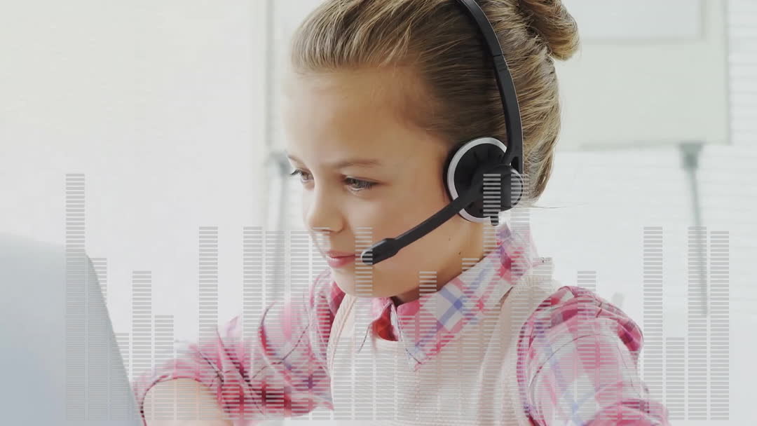 Young girl wearing headset working on computer with digital data graphics overlay. This visual can be used for educational content, online communication themes, or promotions for digital learning platforms showcasing technology use by young learners.
