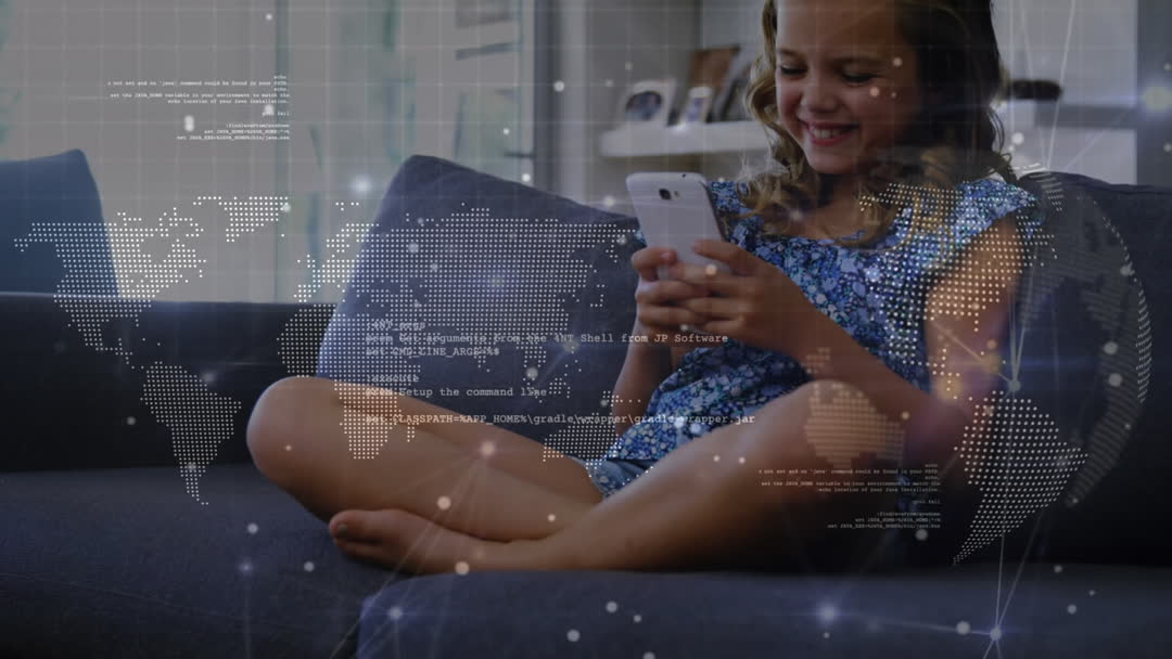 Young girl sitting in living room using mobile phone while digital graphics suggest global connectivity and networking. Useful for themes on childhood technology habits, digital native lifestyles, IT education or telecommunications marketing.