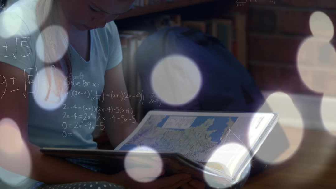 Young girl intently reading a book with mathematical equations giving sense of efficiency associated with education and exploration. Overflow with passion and discovery on social contexts or classroom environments seems the theme. ? It can enhance educational materials, libraries posters or academic learning items’ listings communicating limitless effort tasks depend-remove obstacles-opening pathways mentioned intelligence adventures during archives.