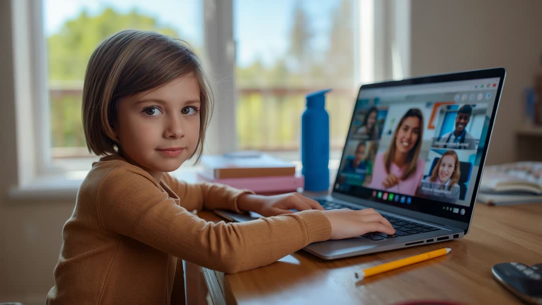 AI Generated Video. A young girl intensely focused on her laptop, engaging in a remote learning session. She is attending a video call, suggesting digital interaction for educational purposes. This visual can be used to depict the rise of home-based learning options, teaching adaptability, and digital fluency among children. It is suitable for educational materials, online learning resources, and articles highlighting technology in education.
