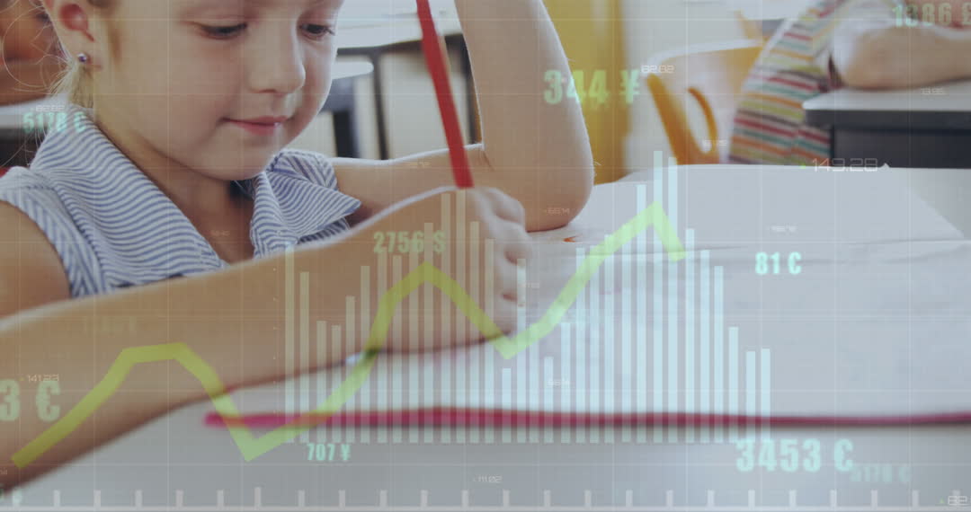 Blends traditional learning with modern technology by featuring a young girl concentrating on her work, overlaid with economic data graphics. Useful for illustrating concepts of education and technology integration, promoting learning apps or educational analytics platforms, or raising awareness about tech impacts in schooling environments.