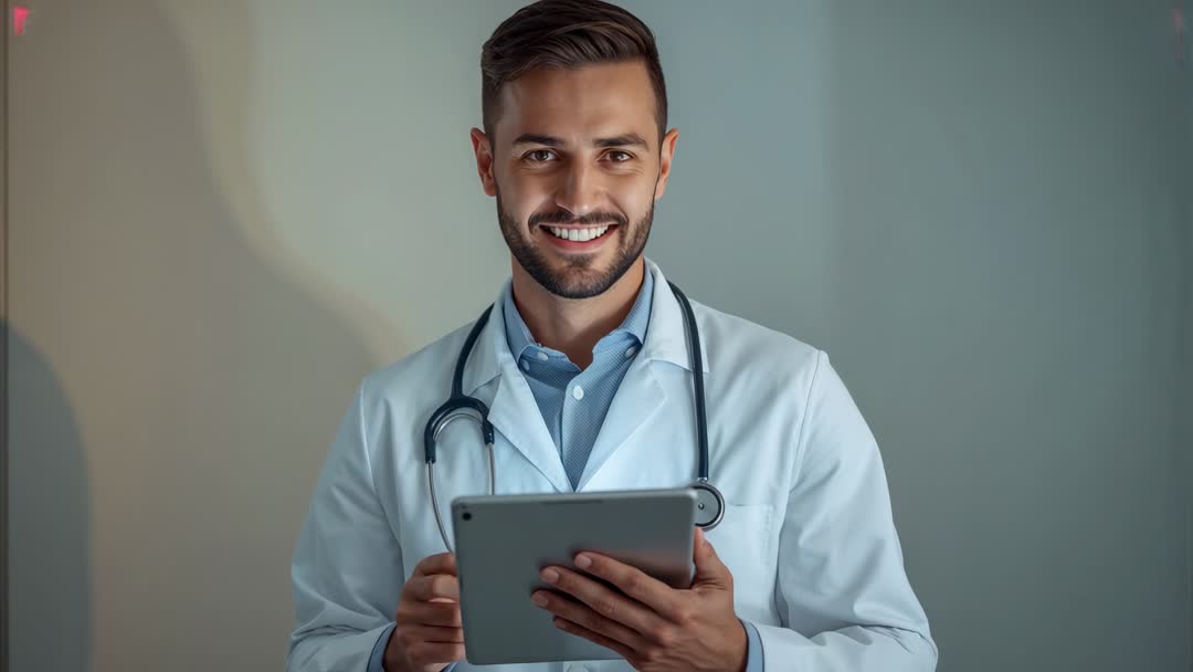 AI Generated Video. Showing confident young male doctor in white coat with stethoscope, holding and tapping tablet while smiling toward camera. Clip capturing modern clinician using digital tools for patient notes, telehealth consults, and electronic health records. Warm lighting and direct eye contact conveying approachability, competence, and trust. Useful for promoting telemedicine services, illustrating digital patient record workflows, creating clinic website hero banners, producing healthcare app demos, enhancing training modules, and supporting marketing campaigns for medical technology. Suitable for use in social media posts, corporate healthcare presentations, patient education videos, and editorial content about modern medicine and clinical innovation. Shot working well with overlay text, lower third graphics, and call-to-action elements.