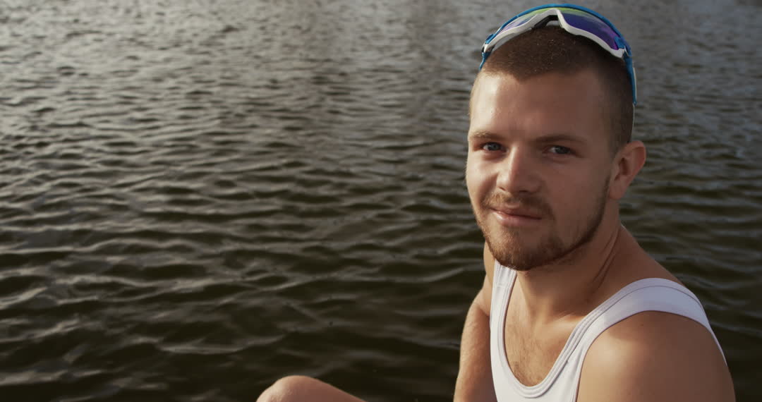 This dynamic video features a young male athlete taking a break with a determined yet relaxed expression after an intensive rowing session. His light attire and fitness suggest that the scene is captured in warm weather, hinting at peak physical condition and summer activities. Ideal for use in promotions related to fitness, motivation, and outdoor sports activities. Inspirational quotes or content dealing with dedication and resilience in sports will pair well with this video.