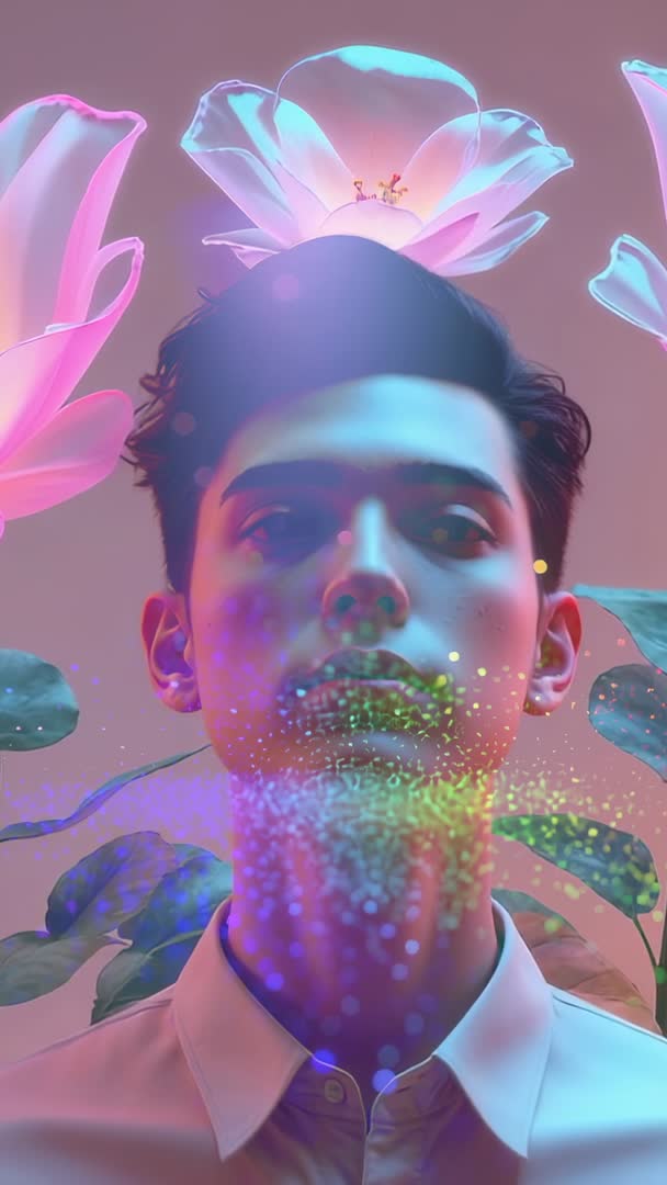 - Young Man Embracing Luminescent Particle Veil with Floating Giant Flowers Vertical Video