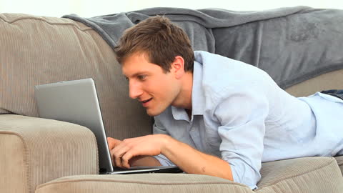 A young man is lounging comfortably on a couch while using a laptop, focused intently on an engaging conversation. This scene represents modern communication practices in a relaxed home setting. Ideal for illustrating themes of technology use, home-based productivity, and casual internet browsing.