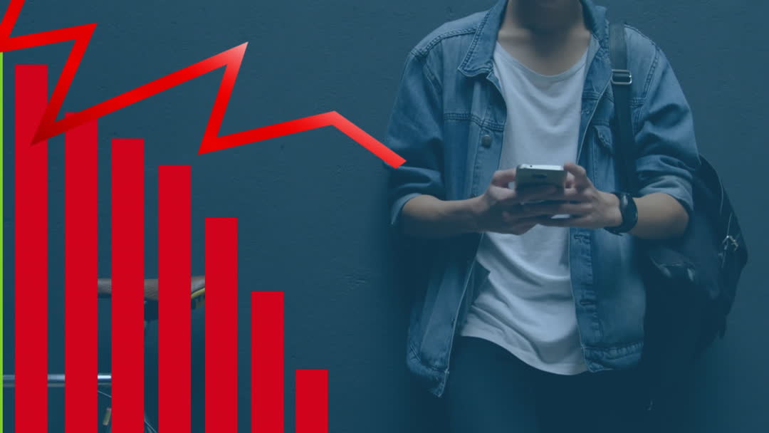 Image shows a young man leaning against a wall, holding a smartphone, which demonstrates engagement with technology and connectivity. A red graph overlaps on the left, suggesting concepts of data analysis, statistics, and business technology. Useful for illustrating digital communication and modern lifestyle in business presentations, technology blogs, or educational material on data trends.