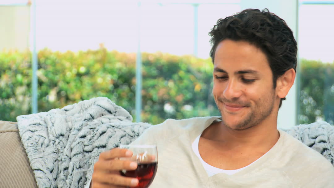 - Young Man Enjoying Red Wine in Relaxed Home Setting