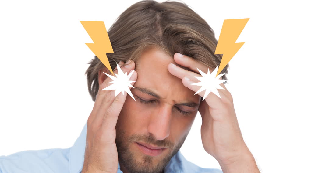 A young man is depicted with expressions of pain, holding his temples. Lightning bolts emphasize the severity of his headache. This can be used for educational materials, health campaigns, or articles focusing on migraines and headache remedies.