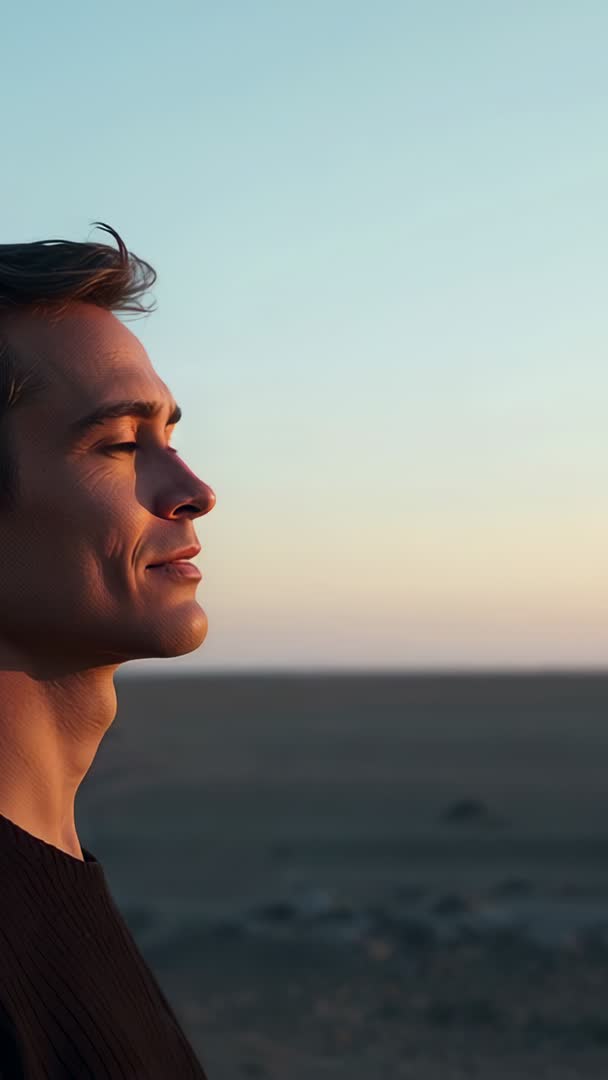 AI Generated Video. Vertical clip showing young man in dark top facing horizon during golden hour. Eyes closed, smiling slightly, breathing slowly while soaking warm sunset light. Wide negative space on right offering clean area for text overlay or motion graphics. Soft warm tones and shallow depth creating peaceful mood and intimate portrait feel. Ideal for wellness apps, meditation guides, mental health campaigns, mindful breathing tutorials, lifestyle reels, travel and adventure promotions, hero banners on websites, social media stories and ads, corporate wellness content, skincare and men's grooming campaigns. Styling notes: natural light, sunset glow on face, relaxed expression, minimalist composition. Format tips: vertical 9:16 clip optimized for mobile stories and reels, leaving ample copy space for headlines, logo placement, or animated captions.