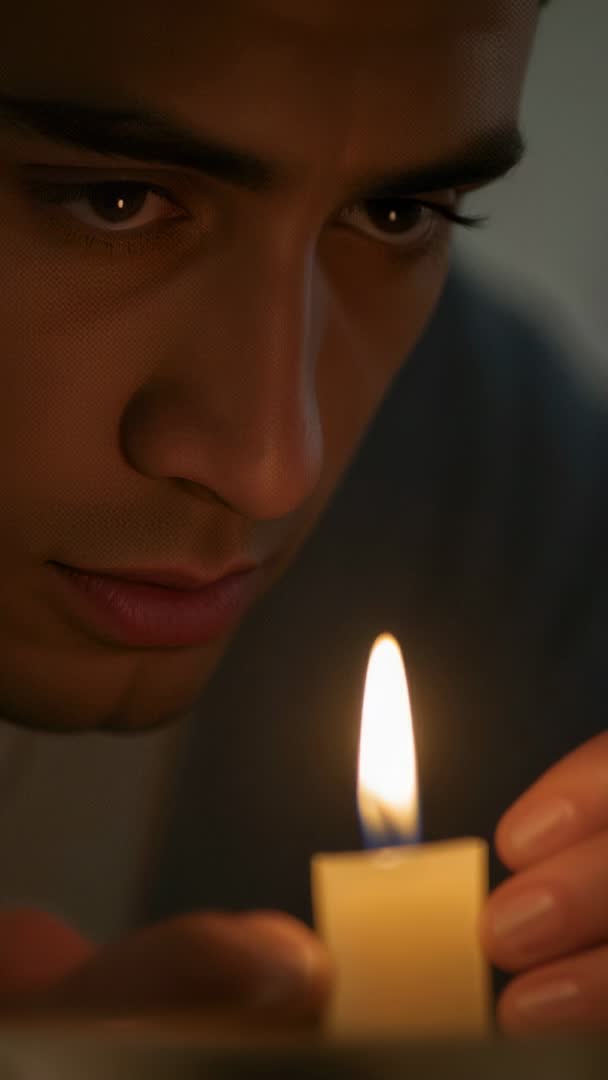 AI Generated Video. Featuring closeup vertical video of young man holding lit candle near face studying wick by warm flame. Creating intimate, contemplative mood with soft candlelight, moody shadows, tight framing, shallow depth of field and warm color tones. Suiting social media reels, short-form video, meditation and mindfulness apps, romantic or spiritual scenes, instructional clips on candle care or fire safety, and promotional projects needing introspective moment. Offering versatile clip for editing into longer narratives, background b-roll for wellness content, or standalone short loop for ambient atmosphere.