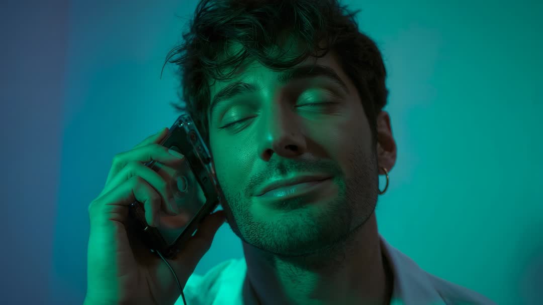 AI Generated Image. Showing young man listening to music while holding retro wired cassette player to ear in closeup video clip. Capturing serene expression with closed eyes and subtle smile, bathed in teal and green studio light, creating moody cinematic atmosphere. Featuring hoop earring and white shirt adding modern fashion detail. Working well for music-themed video projects such as playlist promos, music blog reels, podcast thumbnails, retro tech features, mental wellness segments about music and relaxation, lifestyle commercials, social media ads, album teaser clips, title backgrounds. Editors looping clip for B-roll, adding text overlay for banners or thumbnails, using as hero shot on landing pages or app intros. Ideal for creative teams seeking retro aesthetic and intimate, relaxed mood.