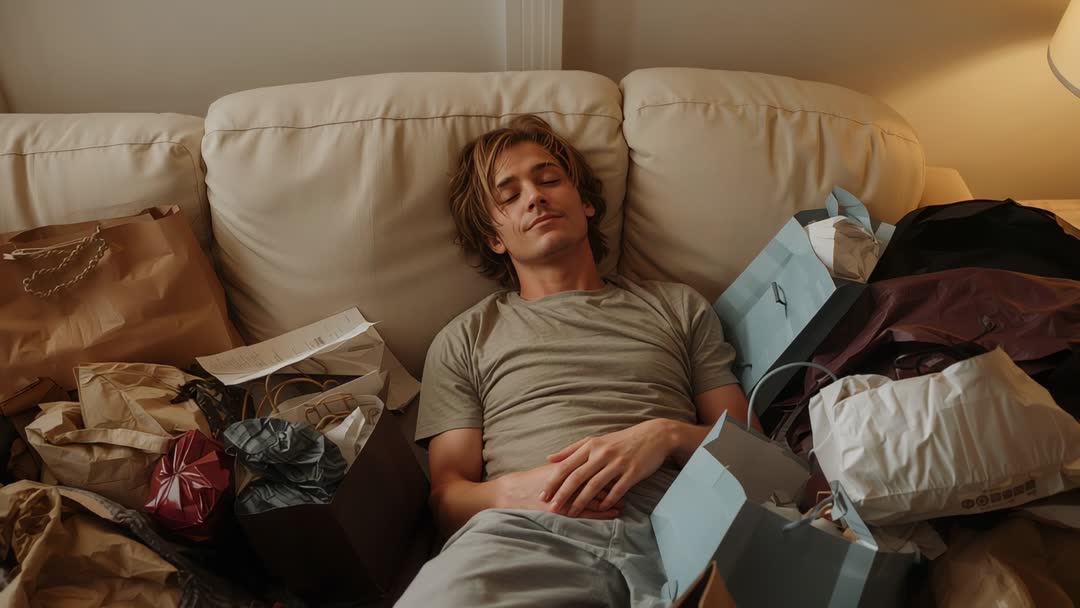 AI Generated Image. Showing young man reclining on cream leather couch surrounded by shopping bags and gift boxes, resting after shopping spree. Conveying warm evening mood with soft lamp light and casual wardrobe. Suggesting themes of retail therapy, consumer fatigue, weekend leisure, impulse buying, and home comfort. Fitting for video use in retail campaigns, e-commerce ads, lifestyle blogs, social media reels, and TV segments on personal finance or mental health related to shopping habits. Offering editing options such as slow zoom, warm color grade, subtle ambient music, and overlay text for promotional messages or call-to-action. Including shot variations for B-roll, hero clip, or transitional footage in longer edits.