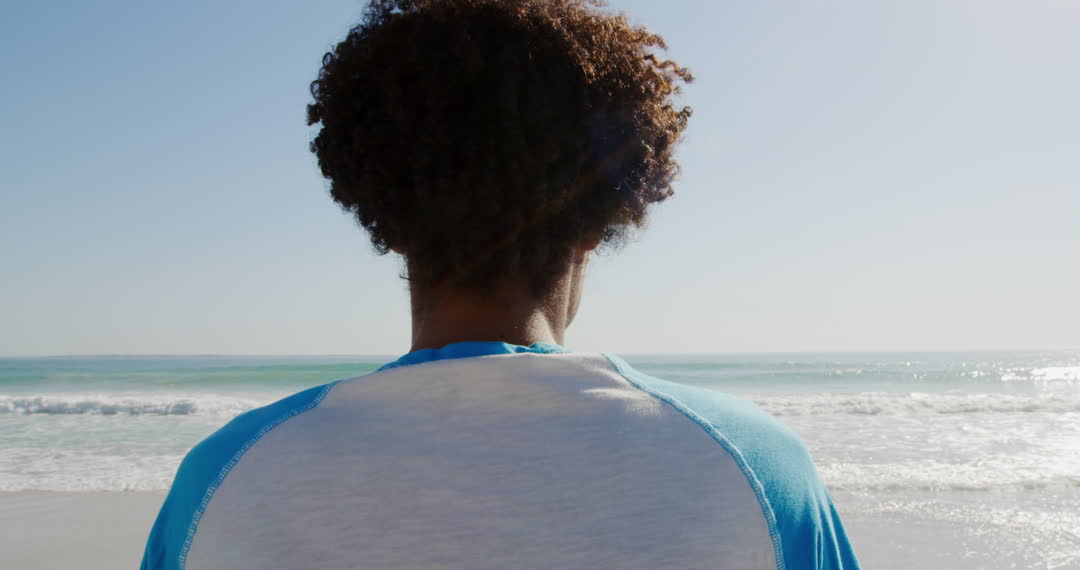 A young man with curly hair, dressed in casual attire, stands peacefully by the ocean. Ideal for ideas related to relaxation, travel, or leisure-focused content. Useful for promoting vacations or beach tourism, evoking a calm and serene atmosphere.