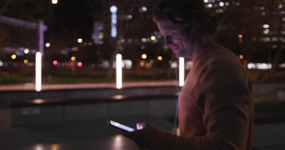 Caucasian man is enjoying nighttime walk in city while using his smartphone. He's casually dressed with earphones and holding a skateboard. The video captures urban lifestyle combining leisure with technology. Suitable for illustrating concepts relating to connectivity, night outings, modern urban life, or youth culture.