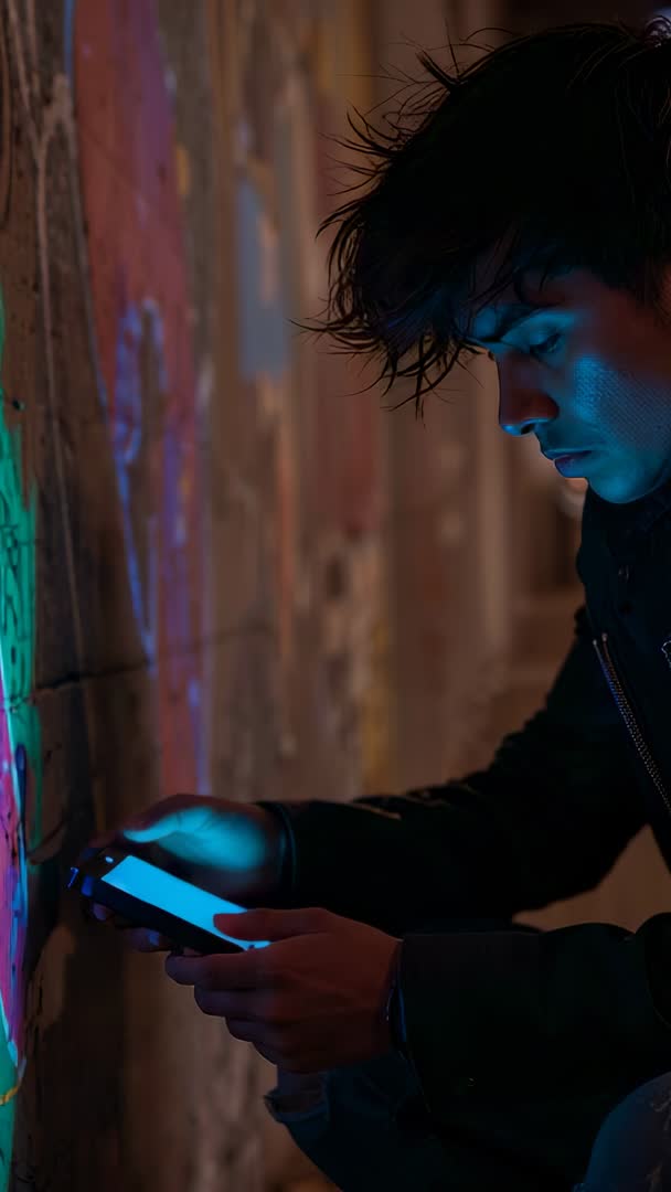 AI Generated Video. Featuring young man tapping and scrolling smartphone while leaning against neon graffiti wall in dim alley at night. Blue screen glow highlighting facial profile and hands, creating moody cinematic atmosphere and strong color contrast. Supporting use in tech and mobile app campaigns, social media reels, app store promos, and editorial stories about youth culture, digital behavior, or urban nights. Suitable for vertical ad creative, Instagram Reels, TikTok content, website hero video, background for podcasts, and cinematic intros. Recommending pairing with ambient street sound, low-tempo electronic track, and teal-orange color grade to amplify neon contrast. Licensing supporting commercial, editorial, and marketing use focusing on technology use, nightlife, city exploration, and personal storytelling.