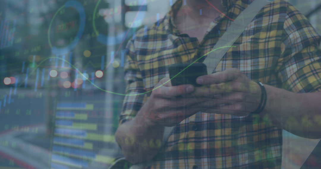 Blending urban lifestyle with technology, this visual captures a young man using a smartphone, overlaid with digital statistical charts. Suitable for illustrating modern communication, tech usage in daily life, and digital trends, it is ideal for marketing materials or articles focused on smartphones, applications, or technology advancements.