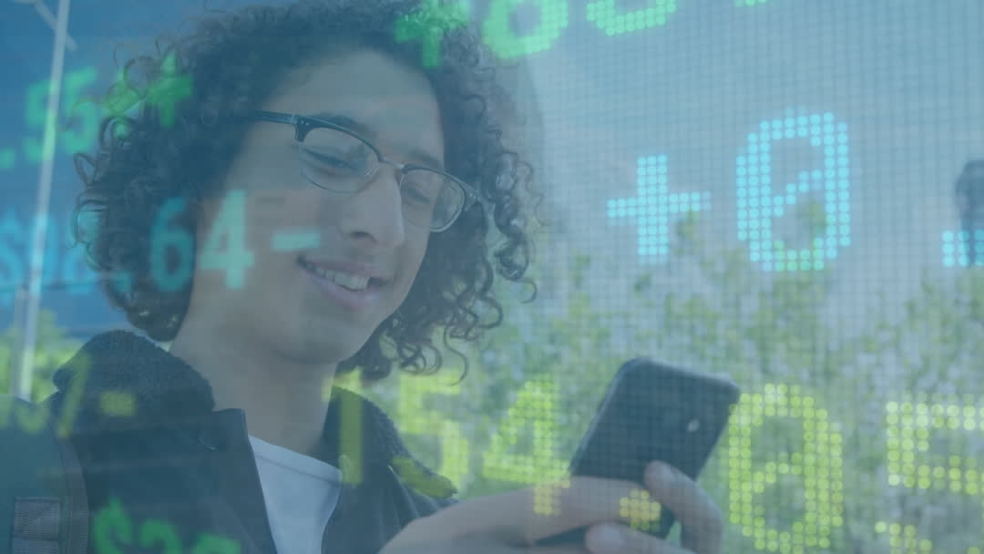 An engaged young biracial man viewing stock market data on his smartphone, with digital numbers overlaid suggesting real-time information and market analysis. Ideal for illustrating themes of modern economy, digital finance, or the impact of technology on investment. Can be used in tech or finance marketing, business articles, or educational content exploring digital trading.
