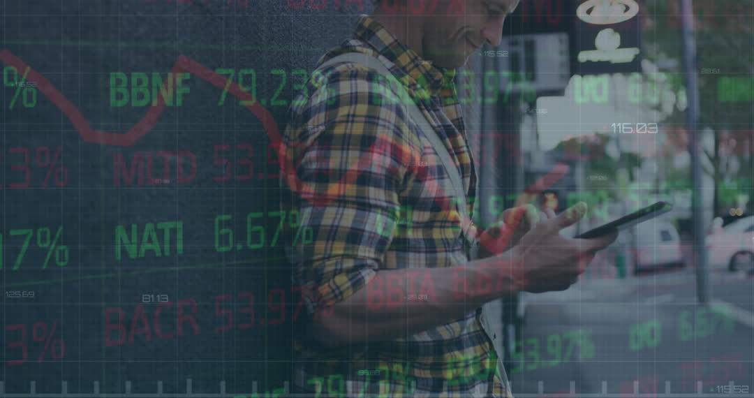- Young Man Using Tablet Amid Digital Stock Market Graphics