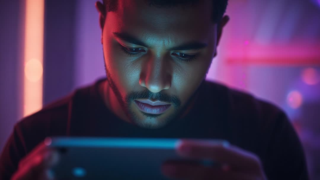 AI Generated Image. Closeup video showing young man using tablet under neon magenta and blue LED lights, featuring concentrated expression and reflective screen glow. Frame focusing on face and hands, conveying deep focus, late-night browsing, gaming, or remote work. Lighting creating cinematic cyberpunk mood with vibrant magenta and teal highlights. Suitable for tech ads, app demos, streaming thumbnails, blog posts about digital wellbeing, online learning, and cybersecurity. Crop for horizontal hero banner or vertical short-form clip; leave space for headline and call-to-action on top or right side. Color grading suggestion: boosting bluish highlights while preserving natural skin tones for dramatic contrast. Use in marketing campaigns, user interface walkthroughs, editorial stories on focus and distraction, or lifestyle features about night-time device use. Mood working well with bold typography, animated overlays, or subtle slow zoom for dynamic motion.