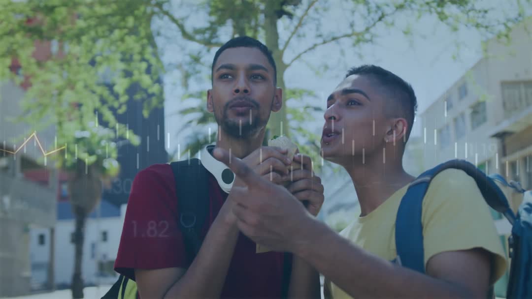 Two young men are seen enjoying ice cream outdoors with a futuristic digital data animation overlay. This visual fusion represents a blend of leisure and technology, highlighting youthful energy, digital fluency, and the casual feel of a summer day spent with friends. It can be used to symbolize modern partnerships or concepts in technology, and it's perfect for projects related to fashion-tech fusion, youth-targeted online content, or experiential advertising.