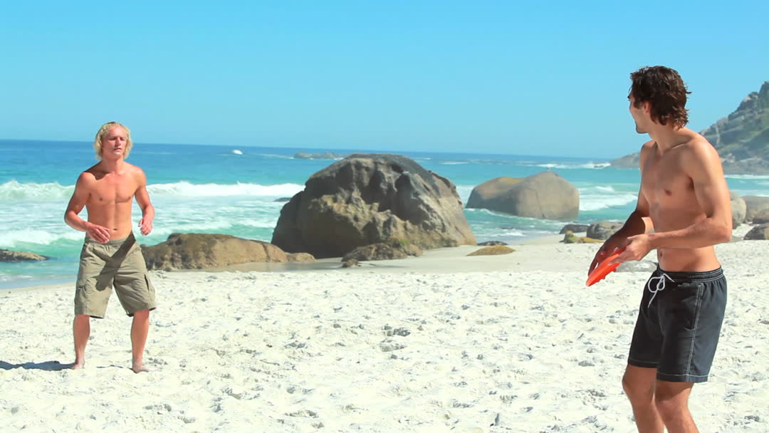 - Young Men Playing Frisbee on a Sandy Beach on a Sunny Day