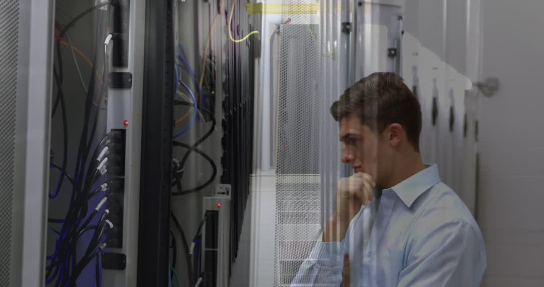 A young professional appears to be deep in thought, analyzing data within a server room, indicating a work environment revolving around technology and data networking. Strong visuals represent high-tech environments typical in IT and communication industries. Suitable for use in themes regarding modern technologies, data management, cybersecurity, and electronic communications.