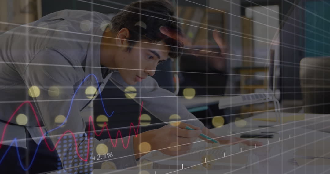 A concentrated young professional is working intensely on financial data, symbolized by superimposed graphs and charts. This visual highlights themes of financial analytics and strategic business thinking. Ideal for use in corporate presentations, finance-themed advertising, and articles about economic forecasting or business growth.