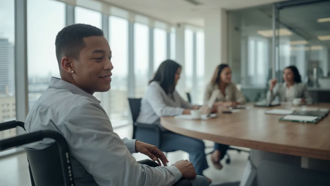 AI Generated Video. Video showing young professional in wheelchair smiling and turning toward colleagues during roundtable meeting in modern office. Background featuring floor-to-ceiling windows and city skyline, adding bright professional atmosphere. Scene highlighting accessibility, workplace inclusion, and collaborative leadership, serving HR campaigns, recruitment efforts, corporate diversity training, and marketing. Clip fitting careers pages, internal training modules, keynote openers, social media employer-branding, and press materials. Layering of natural light and candid interaction creating authentic, optimistic tone for storytelling and promotional content.