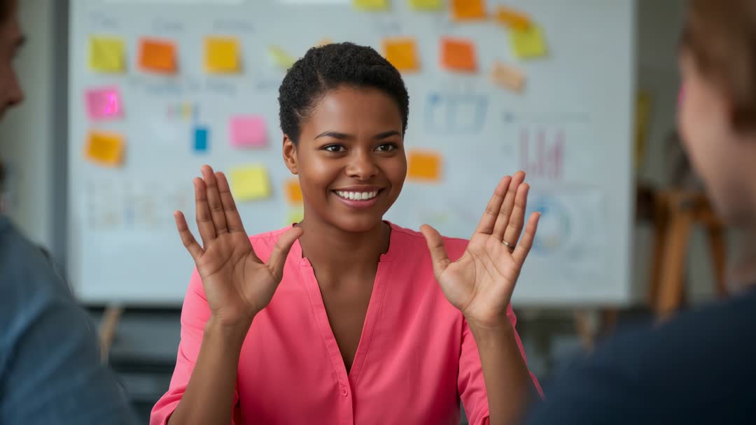 AI Generated Image. Video clip showing smiling woman in pink blouse raising hands while explaining plan during team meeting. Whiteboard covered with colorful sticky notes providing visual context for brainstorming and planning. Scene featuring confident leadership, clear communication, and active collaboration among colleagues. Working great for corporate training videos, team communication guides, leadership articles, startup pitch decks, internal presentations, website hero banners, and social media ads. Use for illustrating teamwork, creative planning, leadership skills, inclusive workplace culture, and agile workflows. Clip adapting well for overlay text, subtitles, cutaway shots, and thumbnail art in explainer videos or promotional campaigns.