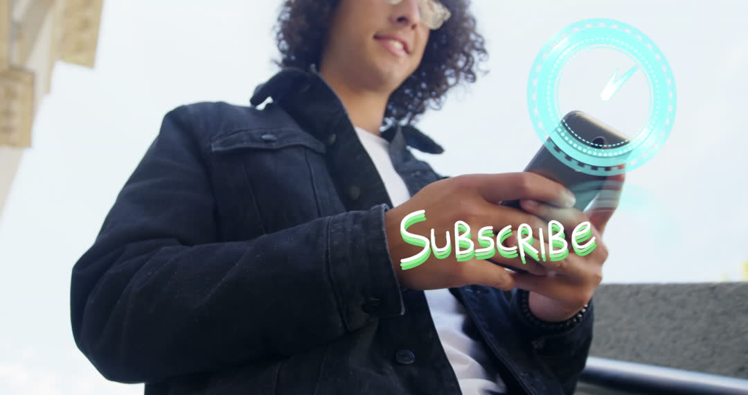 A young professional engages with a smartphone, displaying a virtual 'Subscribe' notification against a backdrop of digital motifs. This video captures the essence of tech-savvy, innovative communication. Ideal for use in content related to digital marketing, advertising campaigns, or promoting online platforms. Demonstrates the interplay between personal devices and digital trends in business.